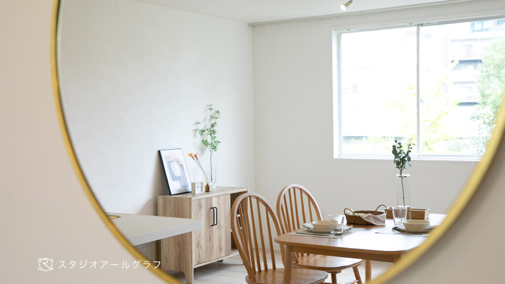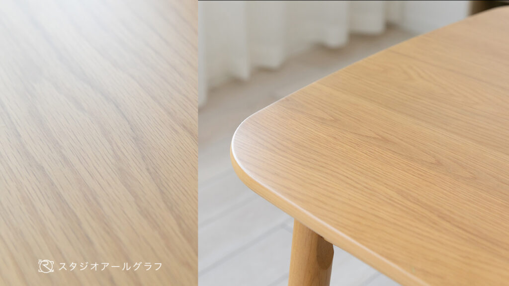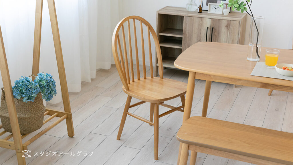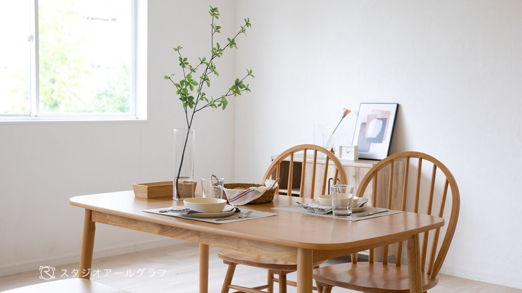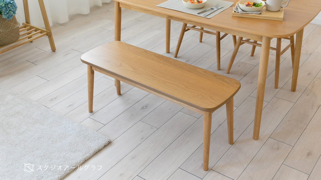こちらもシンプルでナチュラルな木目調のダイニングキッチン。テーブルコーディネートとしてランチョンマットや食器を並べるだけで、リアルな生活感を演出。料理シーンの撮影などテーブルの上に料理を置けば、温かみのある日常カットに。ライフスタイル提案もできます。花やカップ、雑誌などの美品をプラスすることで、シーンに奥行きを与えます。ベンチと椅子の組み合わせが、家族や友人との自然な団らんを演出。木目調の温もりがシンプルながらも柔らかい印象を与え、被写体を引き立てます。