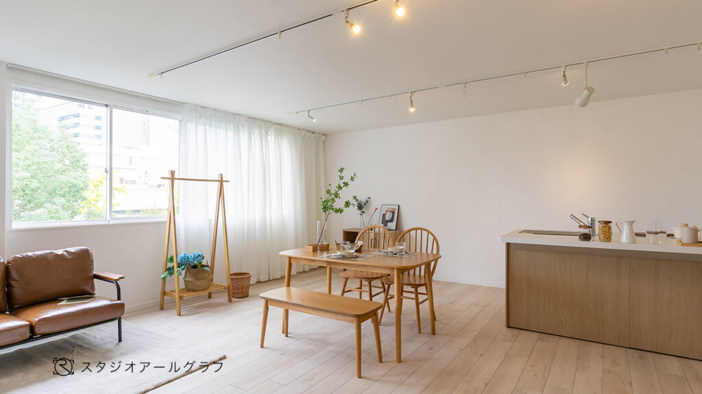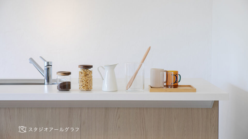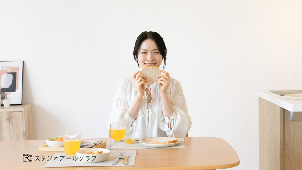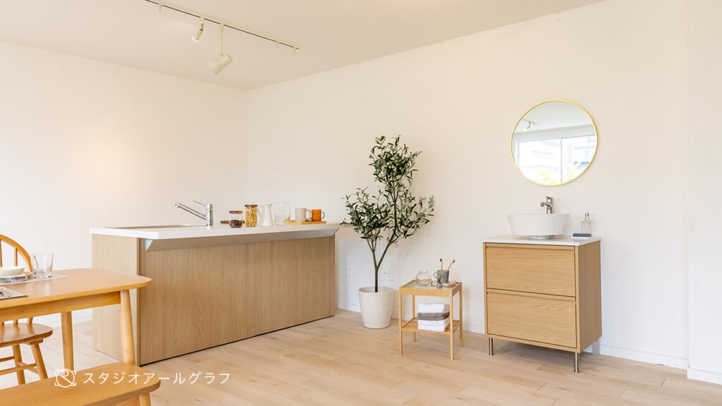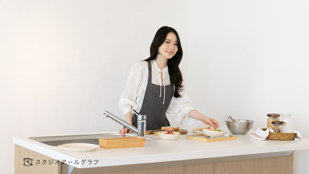大阪福島スタジオには、調理道具や家電の撮影、料理シーンの演出に最適な キッチンセット が完備されています。可動式のキッチンは撮影シーンや構図に合わせて自由に動かせるため、シチュエーションの幅が広がります。日常を感じさせる演出が可能。生活の一部を切り取ったような自然な雰囲気を作り出せるので、商品がリアルに伝わります。キッチンのデザインは、シンプルでナチュラルな木目調と清潔感のある白の天板。背景として主張しすぎず、それでいて商品の魅力を上品に引き立てます。