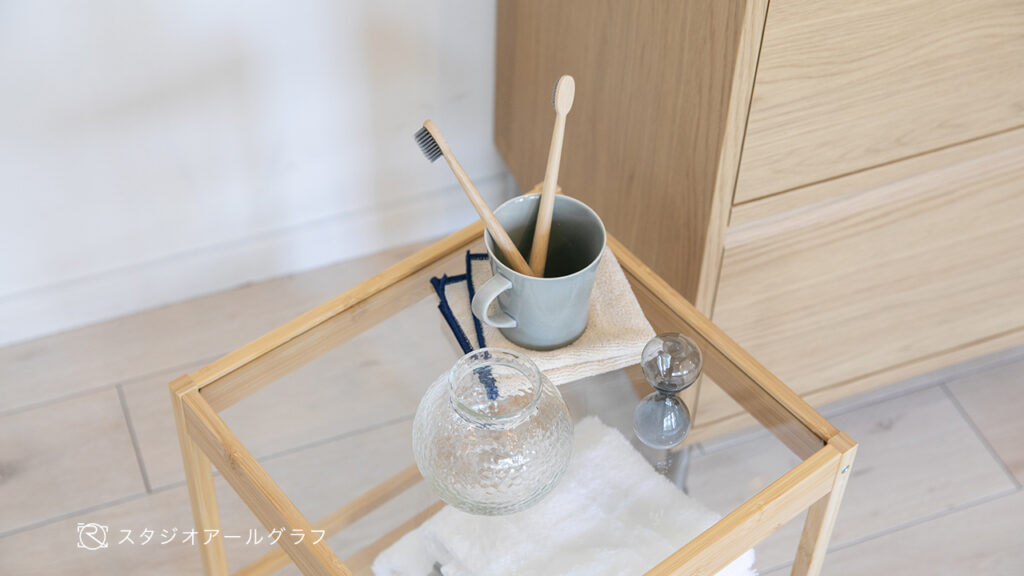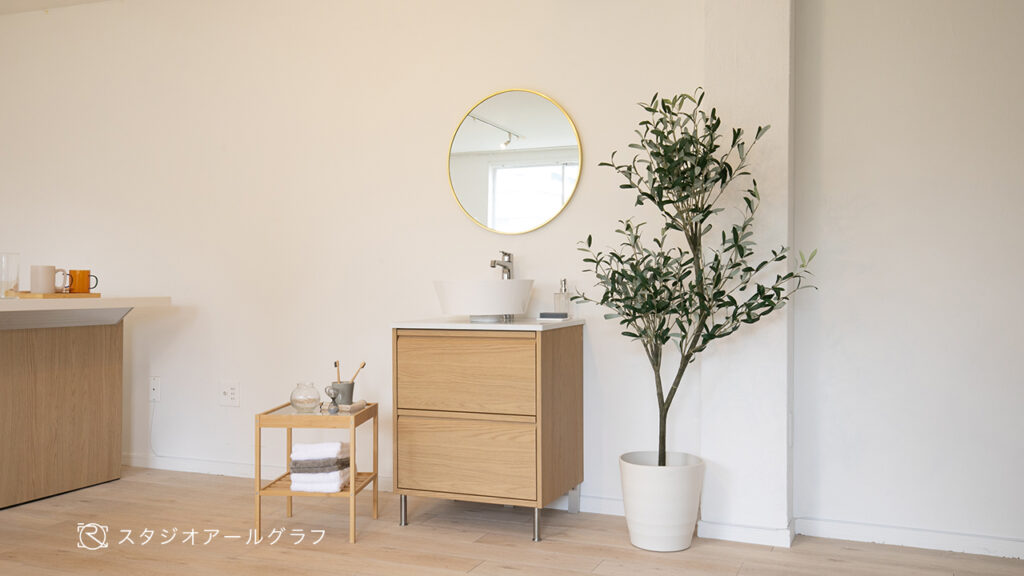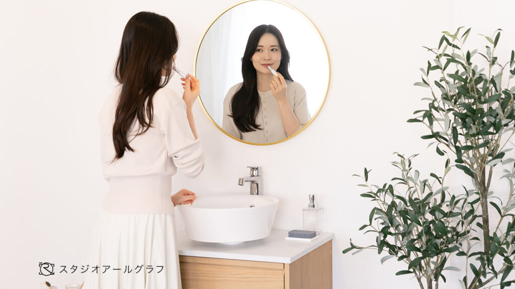 白の清潔感あふれる洗面ボールを設置しています。鏡も完備しているので朝の身支度シーン、化粧品やタオルなどの商品撮影など様々な撮影に応用可能です。スタジオには タオル、歯ブラシ、花瓶などの備品 も用意されています。これらの小物を配置することで写真に温かみや物語性が生まれ、シンプルな商品撮影もワンランク上の仕上がりになります。ざいますのでご使用ください。